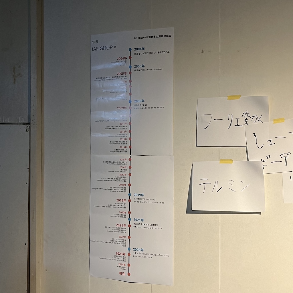 そして、前半、壁に貼られた紙が、調さんの手によって、あるいは口頭で補足が入りながら、演奏のコンダクション的な意味合いで使われていく。