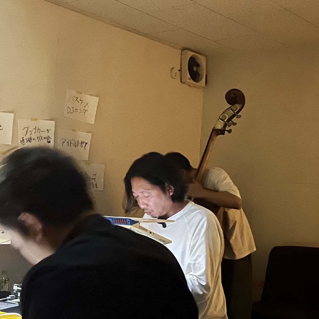 そこでうまれる即興ながらも会話。また他人の音やあるいは過去のIAF SHOP*での演奏録音をサンプリングネタとしてその場で加工していくまさに、現在進行的な即興演奏。